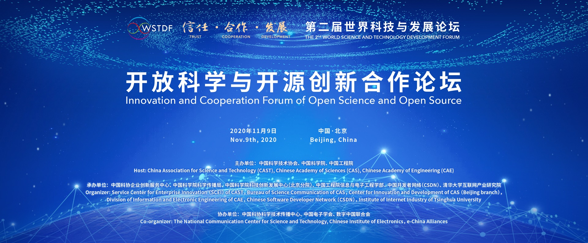 第二届世界科技与发展论坛( The 2nd World Science and Technology Development Forum)贯彻落实习近平主席致首届世界科技与发展论坛贺信精神,以“信任·合作·发展”为主题,坚持创新引领,倡导开放包容,推动互信互鉴,通过打造世界级科技思想策源平台、国际科技合作信任平台、全球技术创新动力平台,促进科技与经济、社会、文化、生态文明融合共生,推动联合国可持续目标实现和人类命运共同体建设。