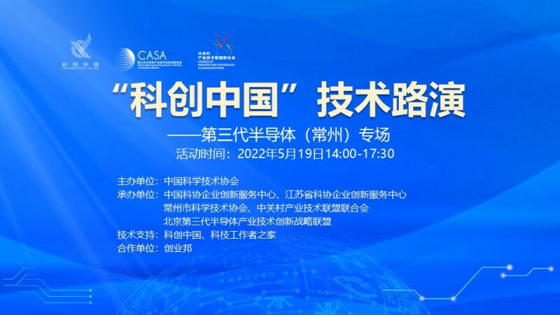 5月19日下午,由中国科学技术协会主办,中国科协企业创新服务中心、江苏省科协企业创新服务中心、常州市科学技术协会、中关村产业技术联盟联合会、北京第三代半导体产业技术创新战略联盟共同承办的2022年“科创中国”技术路演——第三代半导体(常州)专场活动线上举行,通过“科创中国”、科技工作者之家、创业邦等平台宣传推介。北京第三代半导体产业技术创新战略联盟副秘书长赵璐冰主持本期技术路演。