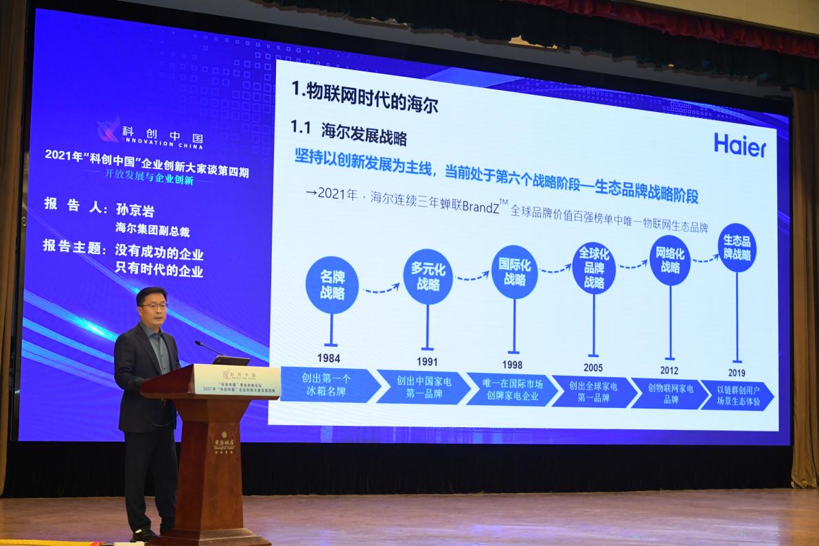 10月21日,以“开放发展与企业创新”为主题的2021年“科创中国”企业创新大家谈第四期活动在青岛举行,该活动由中国科学技术协会主办,中国科协企业创新服务中心与青岛市科协联合承办。现场海尔集团副总裁孙京岩以“没有成功的企业,只有时代的企业”为主题进行分享。